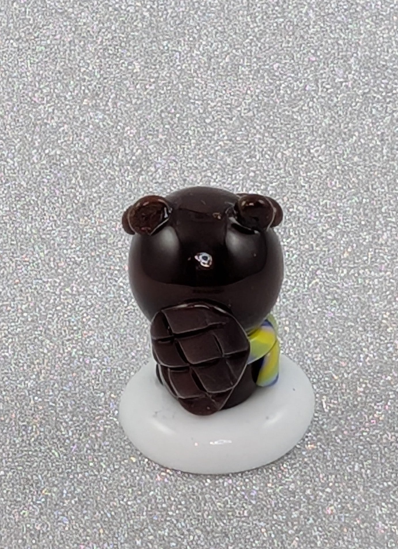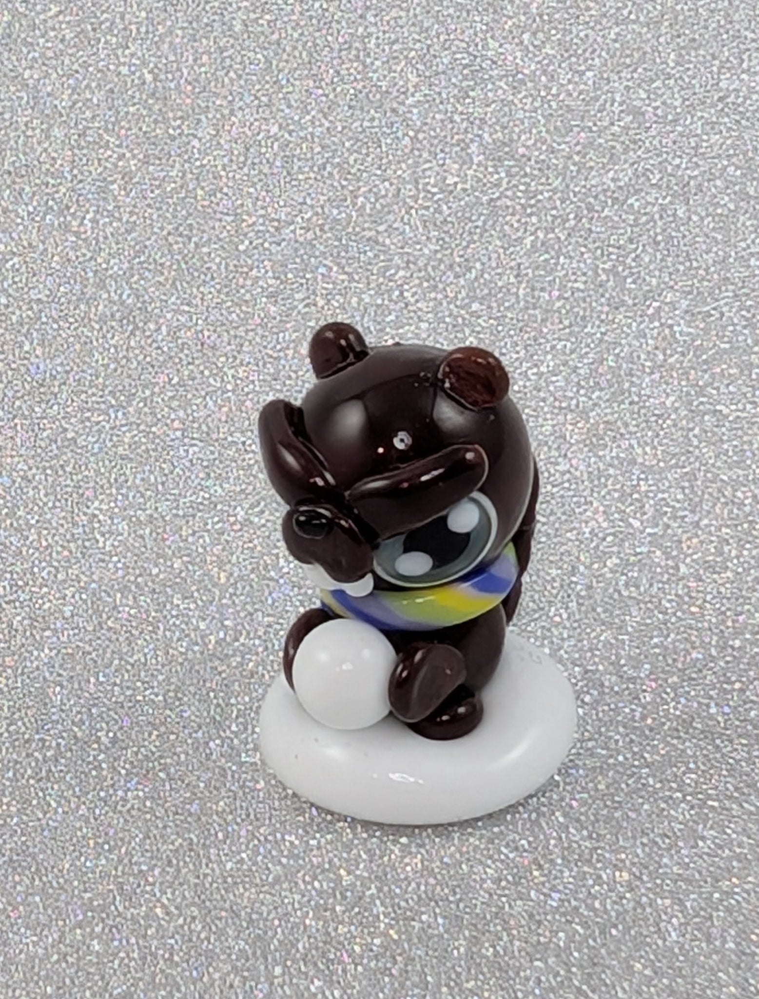 Beavers are sculpted in dark brown and ALL have furrowed grumpy eyebrows. They feature buck white teeth, gridded flat tails and colourful accessories.