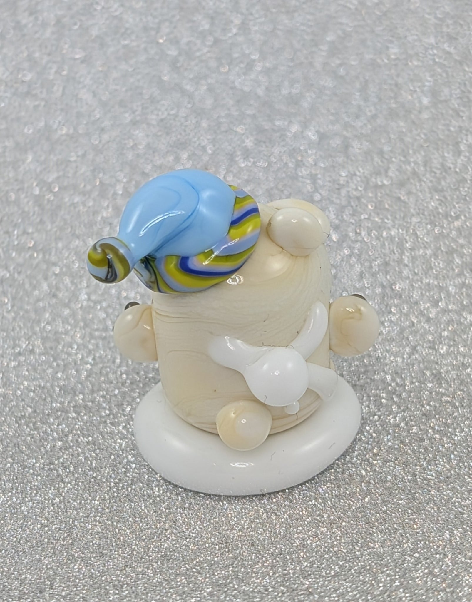 This Polar Bear Adult is grumpy with furrowed eyebrows. He's been splatted twice by snowballs and his little toebeans are visible on his front paws. He sports a blue hat with yellow and blue striped detail.